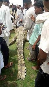 This croc had used to emerge and disappear in the area for a long time, causing panic among the area’ s citizens after it devoured two persons and a number of sheep. Then Famer Mohammad decided to rid the district from its trouble and kept watching for it for three weeks until he managed to gun it down, causing it to precipitate to the bottom of the river. Because of its big size, Mohammad had to call for assistance. Twenty two persons came forward and tied the beast with iron chains and thick ropes and hauled it to the river bank.
