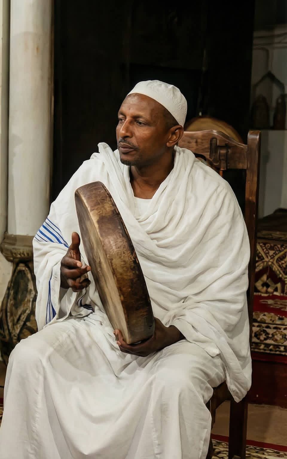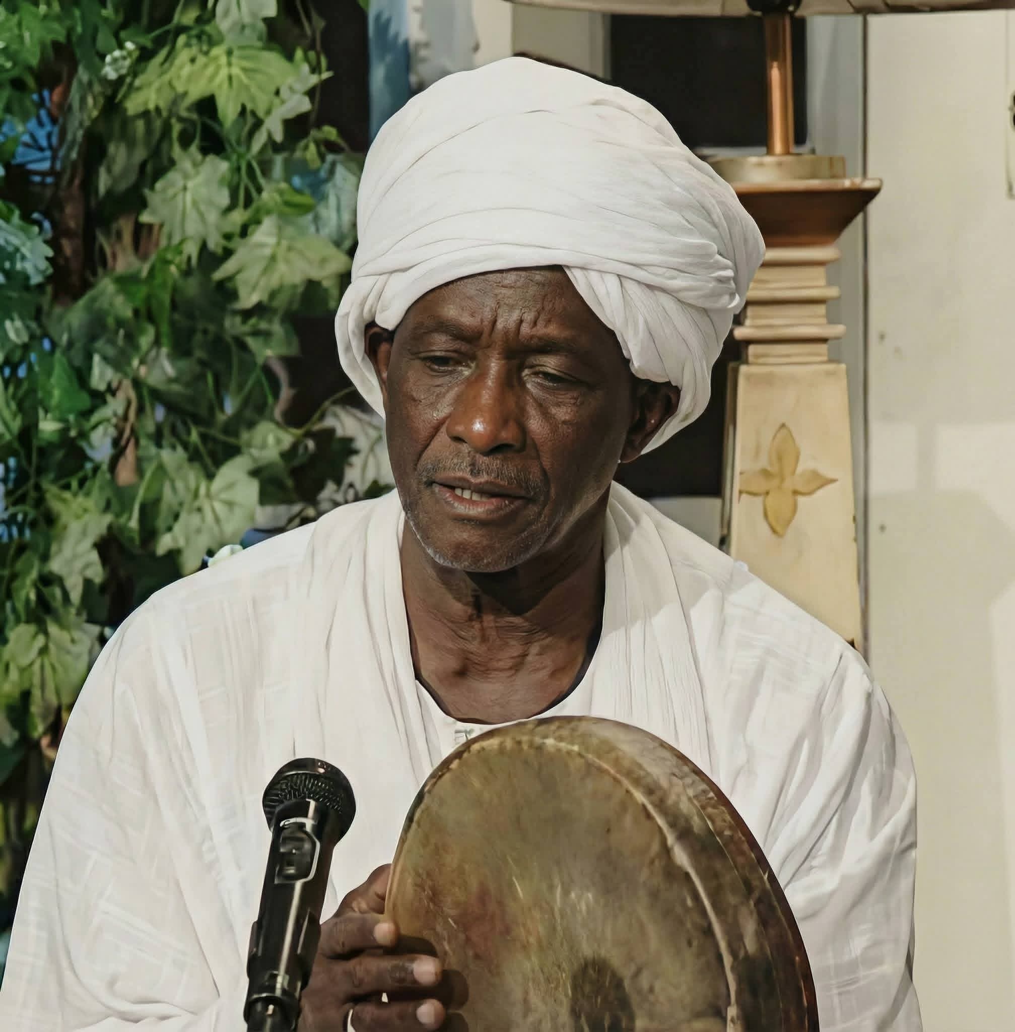 Defining the group members, he began with the lead chanter, Abdalla Dahwi Abdulrahman, a man of quiet dignity whose voice is filled with purity. His most famous performances include "Al-Boxi" (The Pickup Truck), "Ya Taiba Doub Liki" (Deep Longing for Medina), and "Bureek Tibbak" (I Show You Your Cure). Al-Dahwi was born in 1945 and studied in the Khalwas (religious schools) of Al-Zariba. He learned the art of praise at age ten and performed various rhythms like the Murabba, Banati, Ma’ashar, Makhbut, and Harbi.